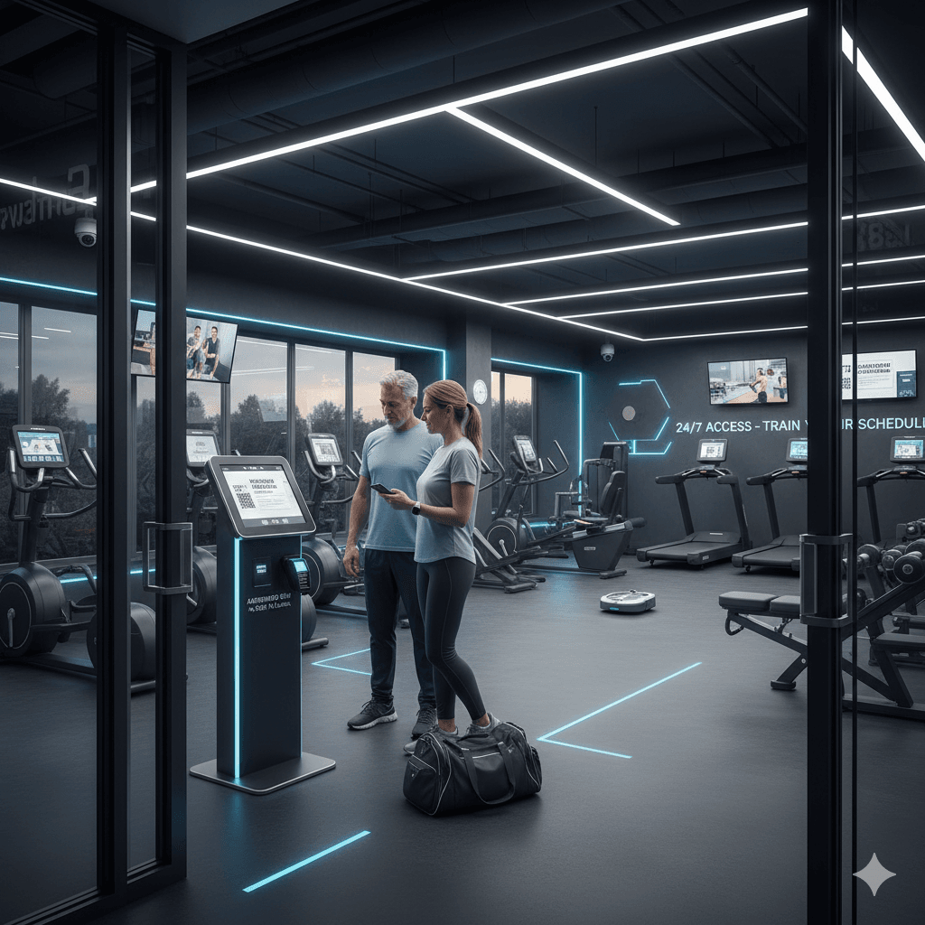 Ein Fitnessstudio ohne ständiges Personal betreiben. Mitglieder trainieren rund um die Uhr mit automatisiertem Zugang und Remote-Betreuung.